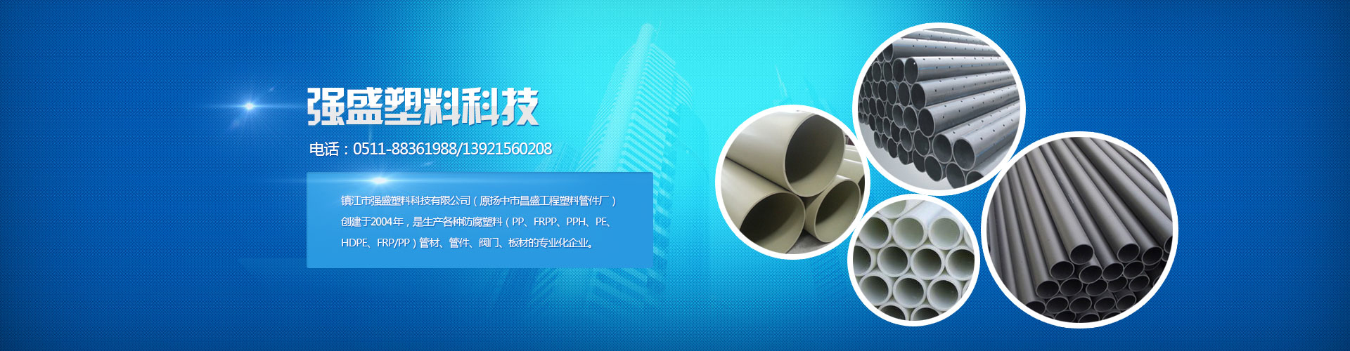 鎮江市強盛塑料科技有限公司(原揚中市昌盛工程塑料管件廠)創(chuàng)建于2004年,是生產各種防腐塑料(PP、FRPP、PPH、PE、HDPE、FRP/PP)管材、管件、閥門、板材的專業化企業。公司擁有各類先進生產設備,固定資產約3800萬元,可生產管材、管件口徑為Φ15-Φ1200mm,產品規(guī)格齊全。目前產品廣泛適用于醫(yī)藥、食品、冶金、造紙、電力、礦山、城市污水處理、垃圾填埋、輕工紡織等領域,暢銷全國各省市自治區,遠銷二十多個國家及地區。